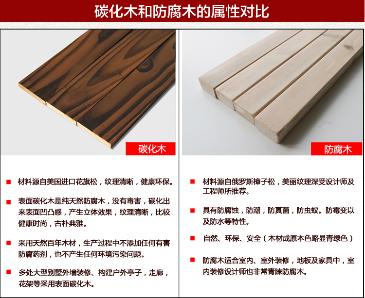 產(chǎn)品用途:本廠專業(yè)生產(chǎn)加工戶外園藝景觀防腐木,炭化木,桑拿板等。主要適用別墅、室外園藝園林、戶外休閑場所、室內(nèi)外裝飾、碼頭橋梁戶外地板等領(lǐng)域。