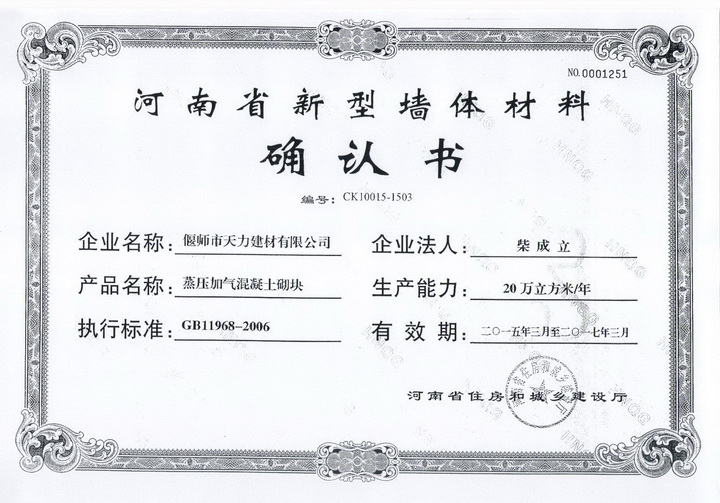 ?????? 偃師市天力建材有限公司。成立于2012年10月,是經(jīng)河南省發(fā)改委備案,洛陽市發(fā)改委批準(zhǔn),也是我市唯一采用自動化生產(chǎn)加氣磚的企業(yè)。本公司堅持科學(xué)發(fā)展觀,積極響應(yīng)國家大力發(fā)展循環(huán)經(jīng)濟(jì)的號召,堅決貫徹執(zhí)行國家環(huán)保政策,公司采用高新技術(shù)致力于粉煤灰的研究開發(fā)、生產(chǎn)制造和應(yīng)用服務(wù),項目總投資3000萬元。其中:環(huán)保型粉煤灰加氣混凝土砌塊磚采用當(dāng)今最先進(jìn)的工藝設(shè)備“伊通”專利生產(chǎn)線,年產(chǎn)能力為6O萬立方。產(chǎn)品已遍布鄭州、洛陽、 平頂山、南陽、三門峽等地,參與建設(shè)多項國家重點施工工程,得到用戶的一致好評。