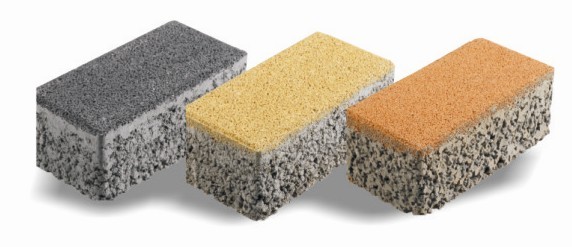 3、 彩石復合混凝土透水磚:材質面層為天然彩色花崗巖、大理石與改性環氧樹脂膠合,再與底層聚合物纖維多孔混凝土經壓制復合成形,此產品面層華麗,天然色彩,有與石材一般的質感,與混凝土復合后,強度高于石材且成本略高于混凝土透水磚,且價格是石材地磚的1/2,是一種經濟、高檔的鋪地產品。主要用于豪華商業區、大型廣場、酒店停車場和高檔別墅小區等場所。