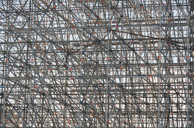 施工現場為工人操作并解決垂直和水平運輸而搭設的各種支架。建筑界的通用術語,指建筑工地上用在外墻、內部裝修或層高較高無法直接施工的地方。主要為了施工人員上下作業或外圍安全網圍護及高空安裝構件等,說白了就是搭架子,腳手架制作材料通常有:竹、木、鋼管或合成材料等。有些工程也用腳手架當模板使用,此外在廣告業、市政、交通路橋、礦山等部門也廣泛被使用。