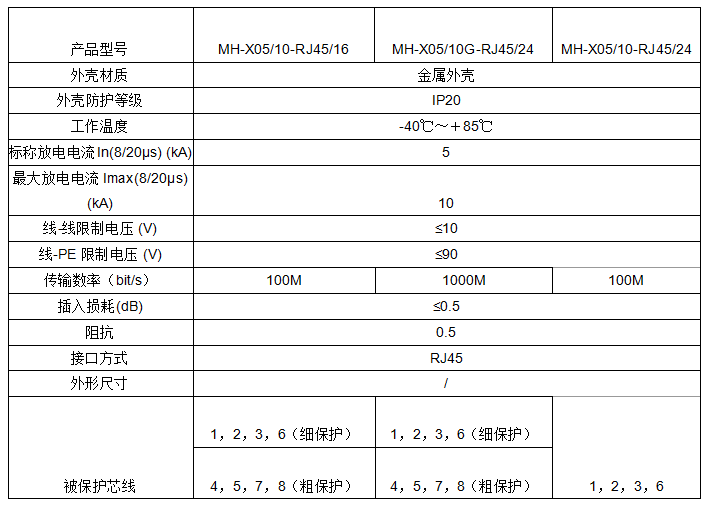 產品的接口形式為標準RJ45接口,保護芯線為8線(12、36、45、78),維護方便。8/20μs最大放電電流Imax可達10 kA/每線,動作反應時間快,適用于高速互聯網絡的雷電浪涌防護。