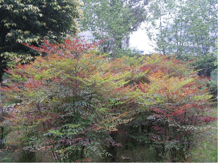 常綠小灌木。莖常叢生而少分枝,高1-3米,光滑無毛,幼枝常為紅色,老后呈灰色。葉互生,集生于莖的上部,三回羽狀復葉,長30-50厘米;二至三回羽片對生;小葉薄革質,橢圓形或橢圓狀披針形,長2-10厘米,寬0.5-2厘米,頂端漸尖,基部楔形,全緣,上面深綠色,冬季變紅色,背面葉脈隆起,兩面無毛;近無柄。